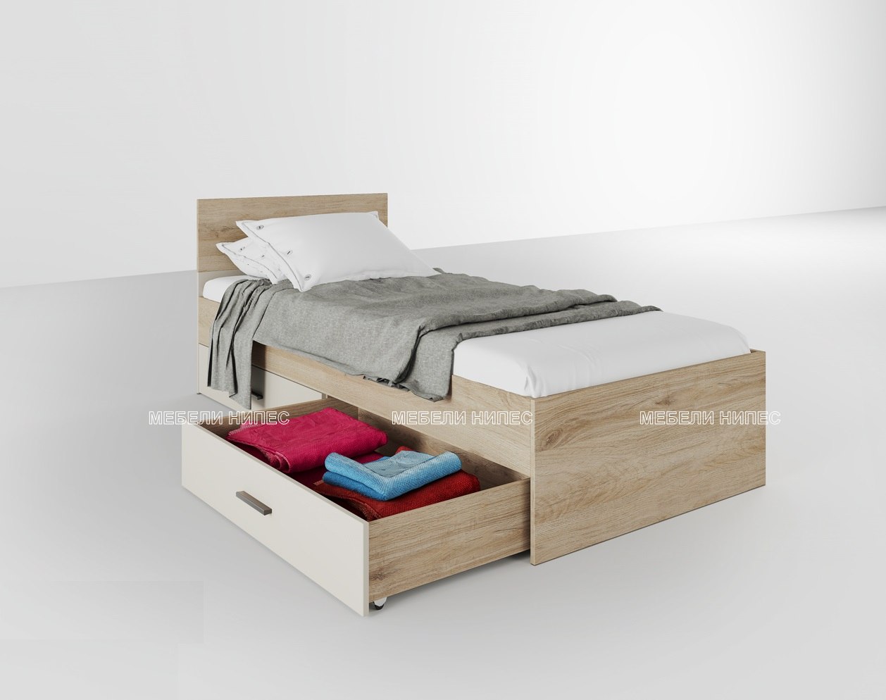 • Пълен комплект с трикрилен гардероб, легло с ракла и чекмеджета и бюро Студио 230 - Мебели Нипес