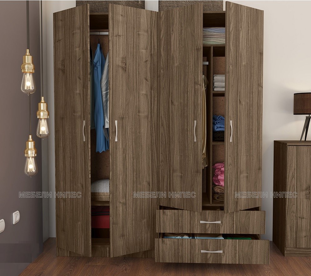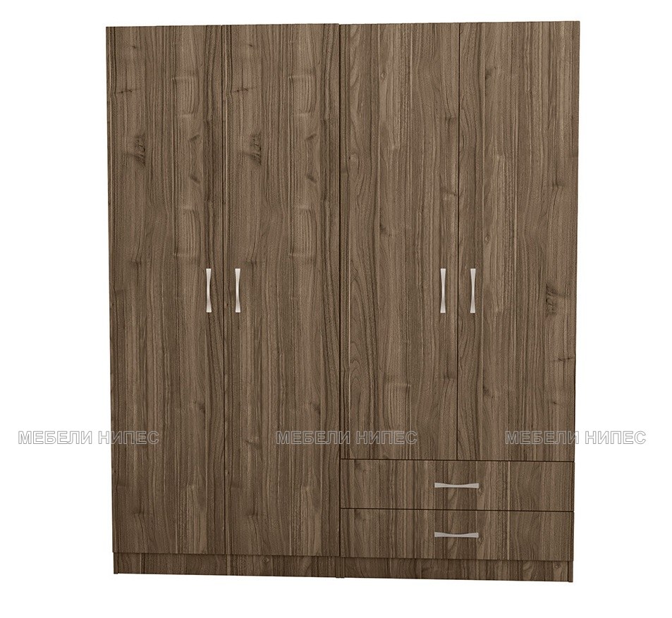 Четирикрилен гардероб Сити 062 орех адмирал е съставен от два отделни двукрилни гардероба. Единият е с вътрешно разпределение рафт и лост, другия е с две чекмеджета и разделен на половина с рафтове и лост за закачалки.
