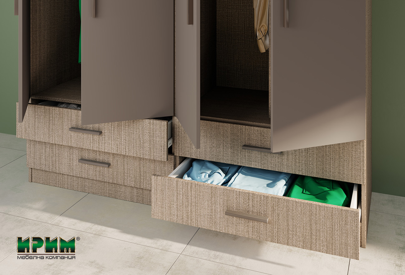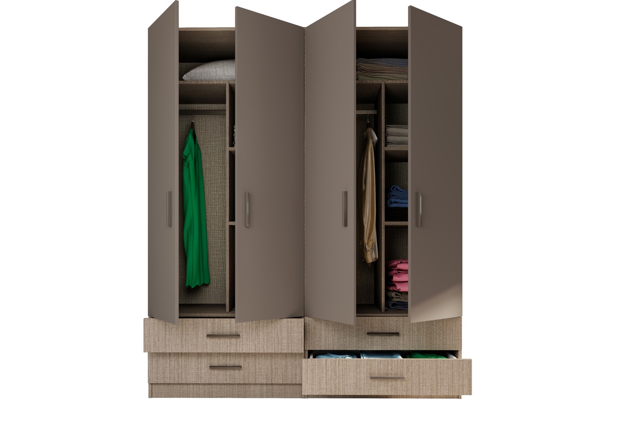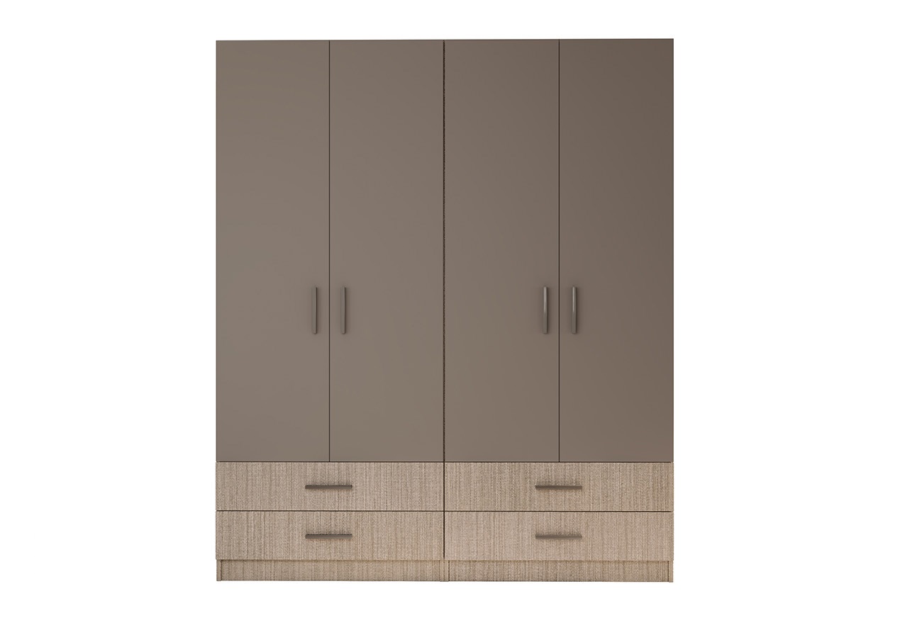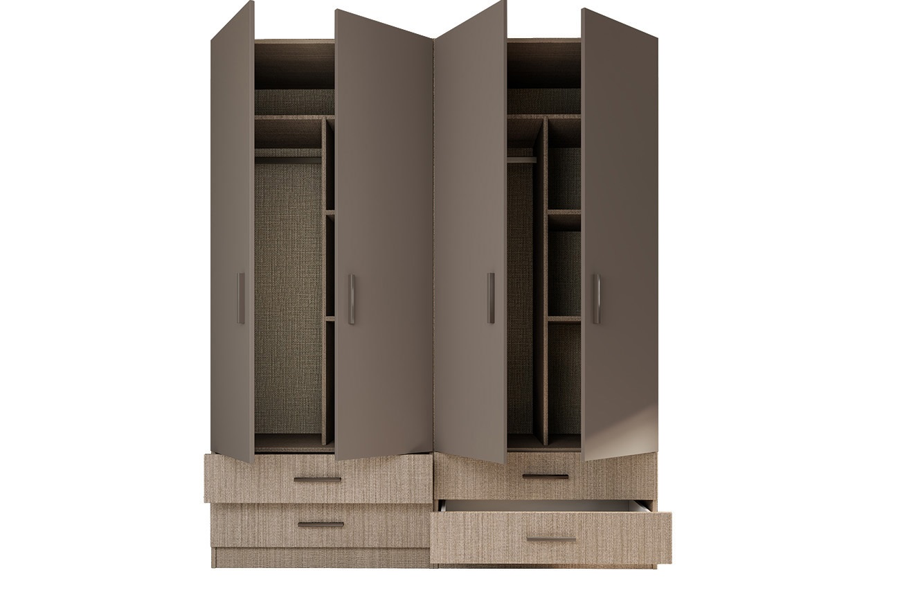 Четирикрилен гардероб Сити 082 мока/лате е съставен от два отделни двукрилни гардероба. И двата гардероба разполагат с две чекмеджета и разделени наполовина с рафтове и лост за закачалки.