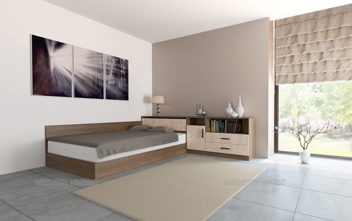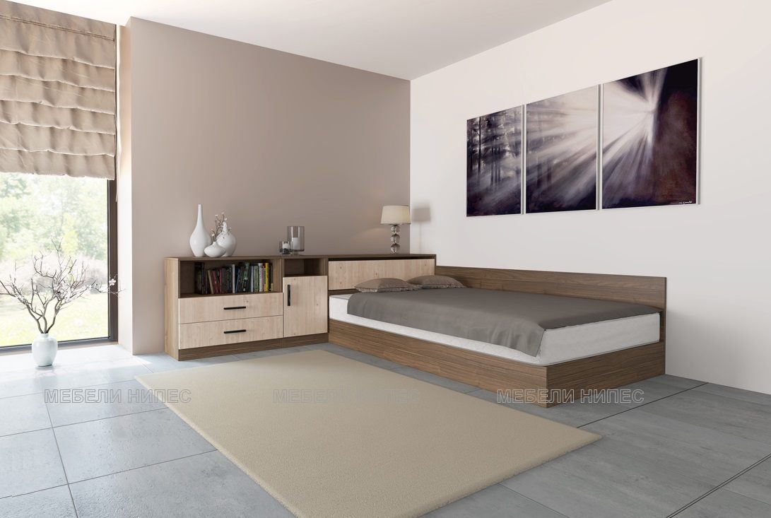 • Пълен комплект с трикрилен гардероб, легло с ракла и чекмеджета и бюро Студио 230 - Мебели Нипес