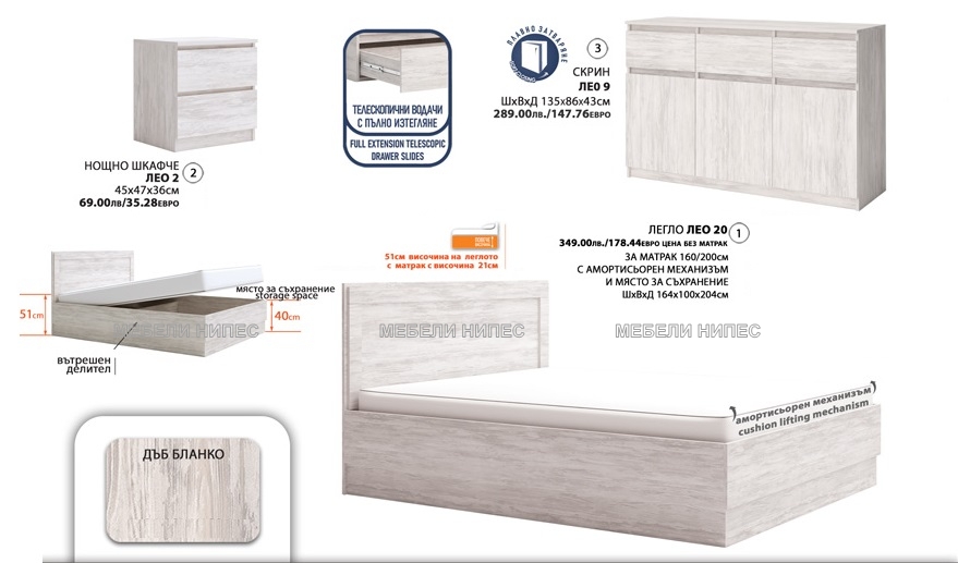 • Комплект с висока спалня Лео 201 дъб бланко info@mebelinipes.com