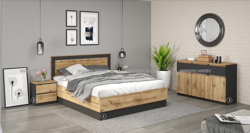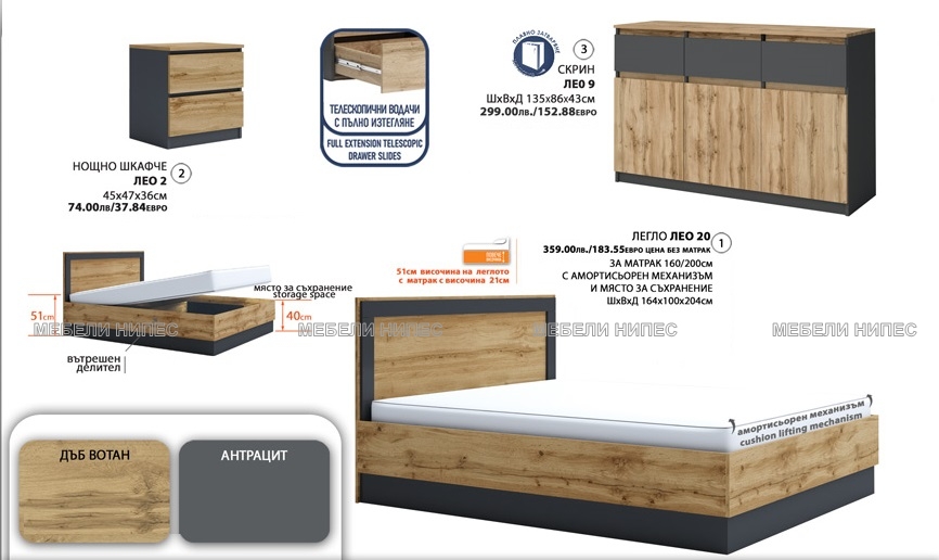 • Комплект с висока спалня Лео 201 дъб вотан/антрацит info@mebelinipes.com