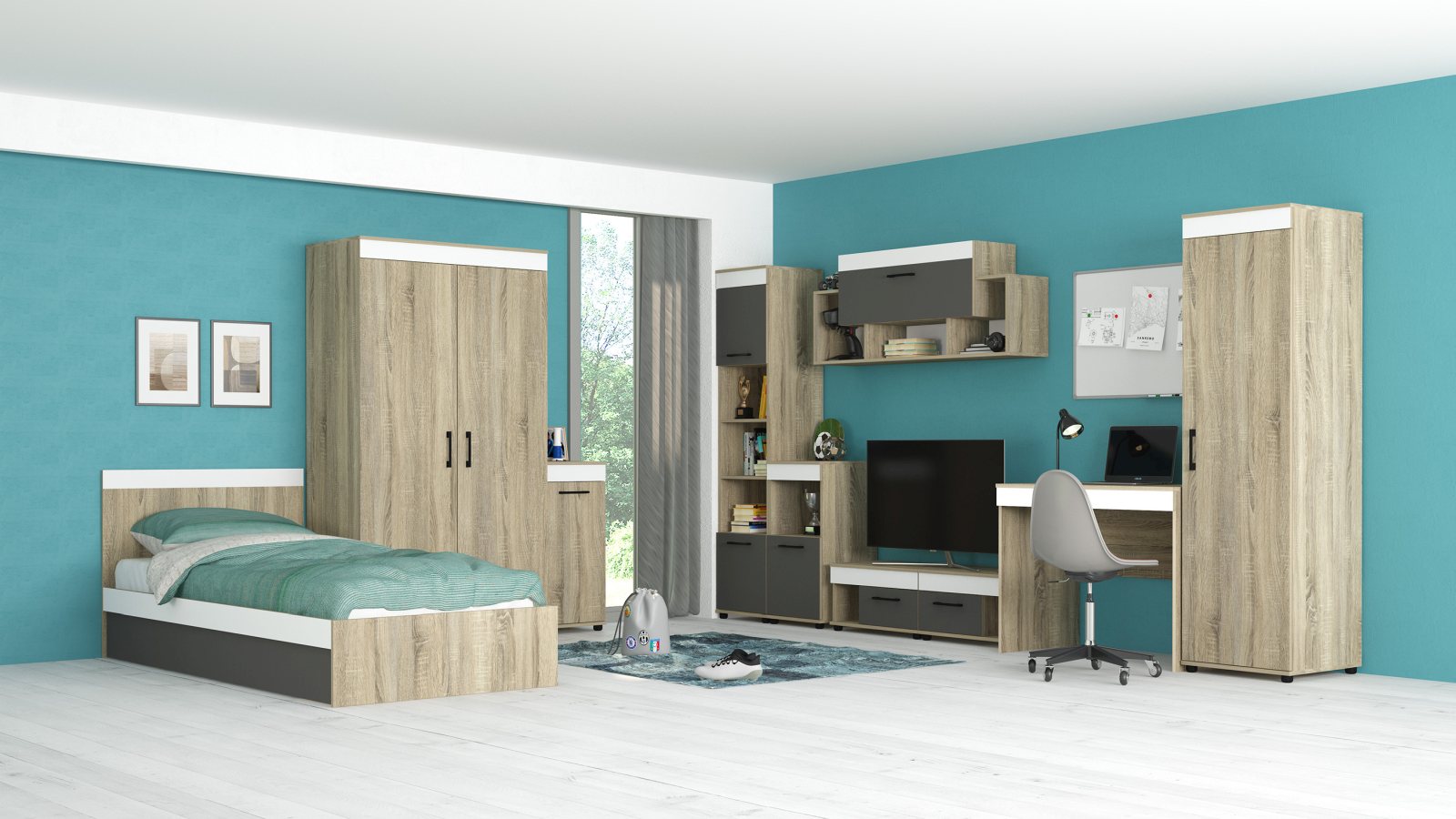 • Пълен комплект с трикрилен гардероб, легло с ракла и чекмеджета и бюро Студио 230 - Мебели Нипес