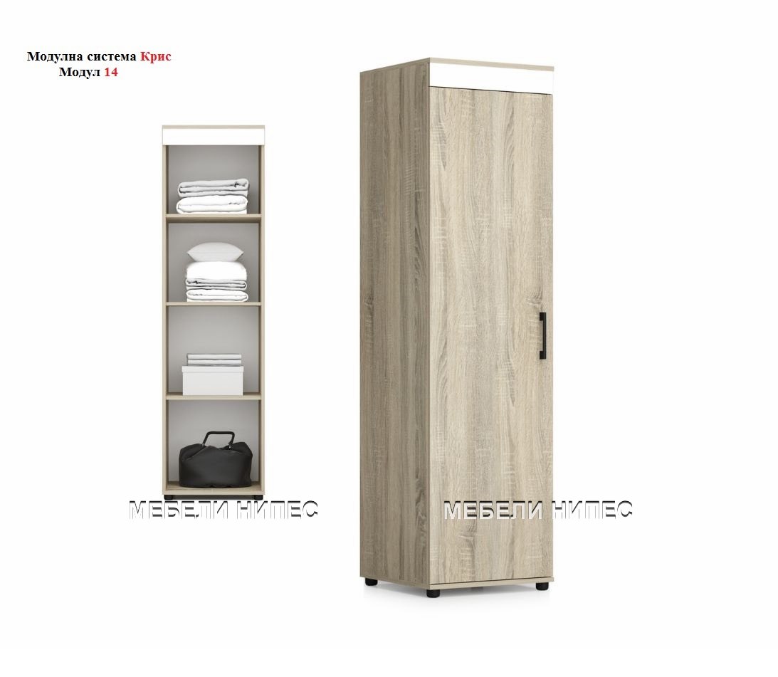 Модул 14 /еднокрилен гардероб с рафтове/ – ширина 50 см, дълбочина 50 см, височина 183 см – Цена: 184 лв