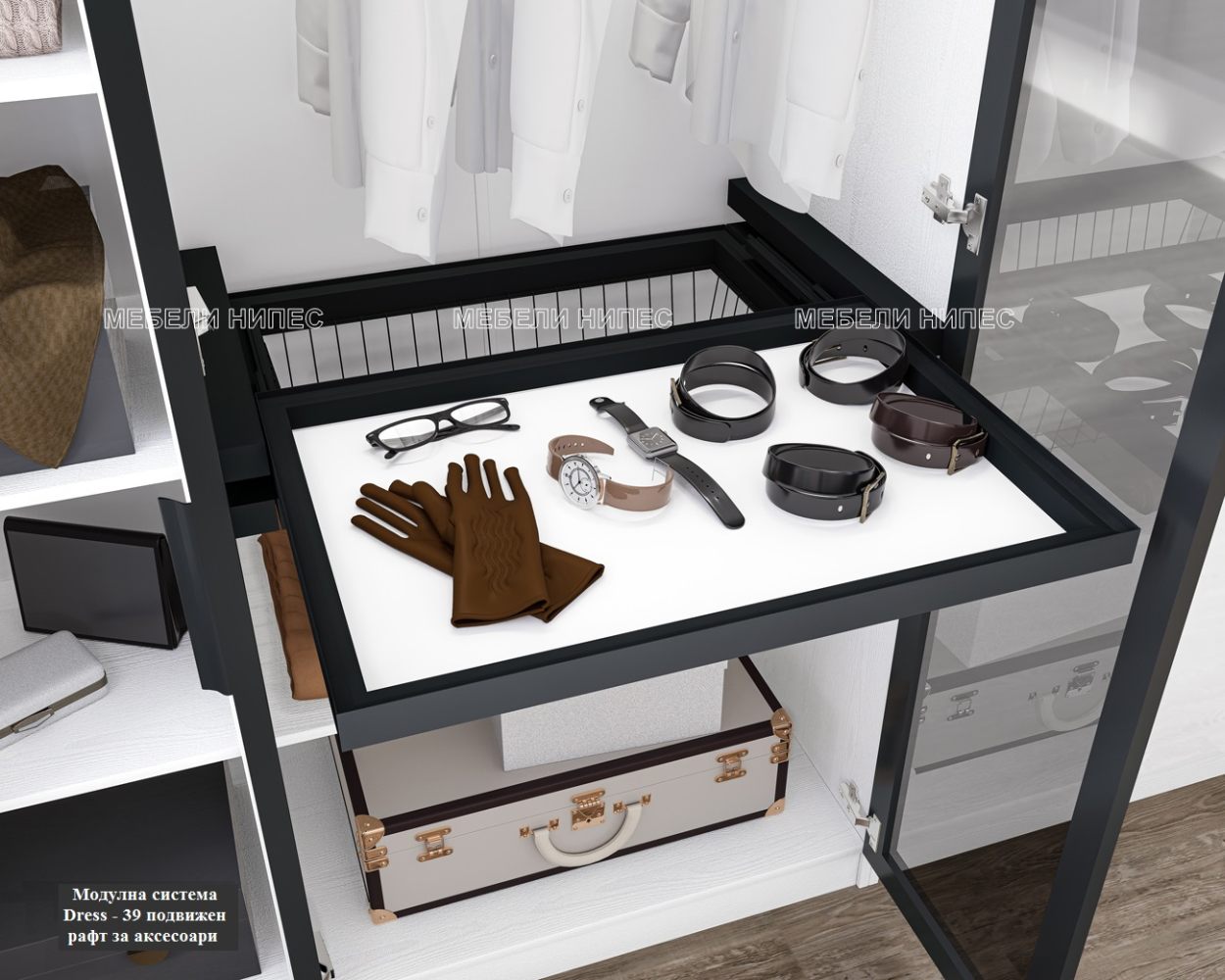 Модулна система Dress e чудесна възможност да организирате и конфигурирате сами вашия гардероб или гардеробиерна. Серията предлага еднокрилен, двукрилен и ъглов гардероб, както и надстройки към тях. Изработени изцяло от бяло фладер, който би подхождал на всякакъв цветови интериор. Можете да окомплектовате всеки гардероб с врати, като избирате от 3 варианта за МДФ, 1 вариант ЛПДЧ и врата от закалено стъкло в сив оттенък обкантено с алуминиев профил с дръжка в цвят антрацит. Хубавото при този тип врати е, че при липса на вътрешна светлина, вътрешността на гардероба не се вижда ясно, а повече стъкления отблясък. При вътрешна светлина визията става абсолютно изтънчена. За целта сме предвидили и лост с лед осветление и сензор за движение. Към всеки гардероб можете да добавите рафтове, а за двукрилния гардероб има разработка за комплект от 2 броя чекмеджета с плавно затваряне. Есктрите които предлага серията са: изтеглящ рафт за аксесоари от бяло фладер в метална рамка и метална кошница с плавно прибиране.