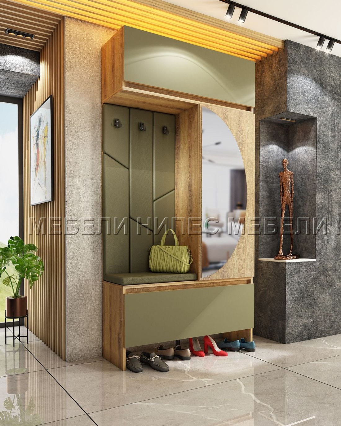 – тапициран гръб със закачалки в цвят маслина