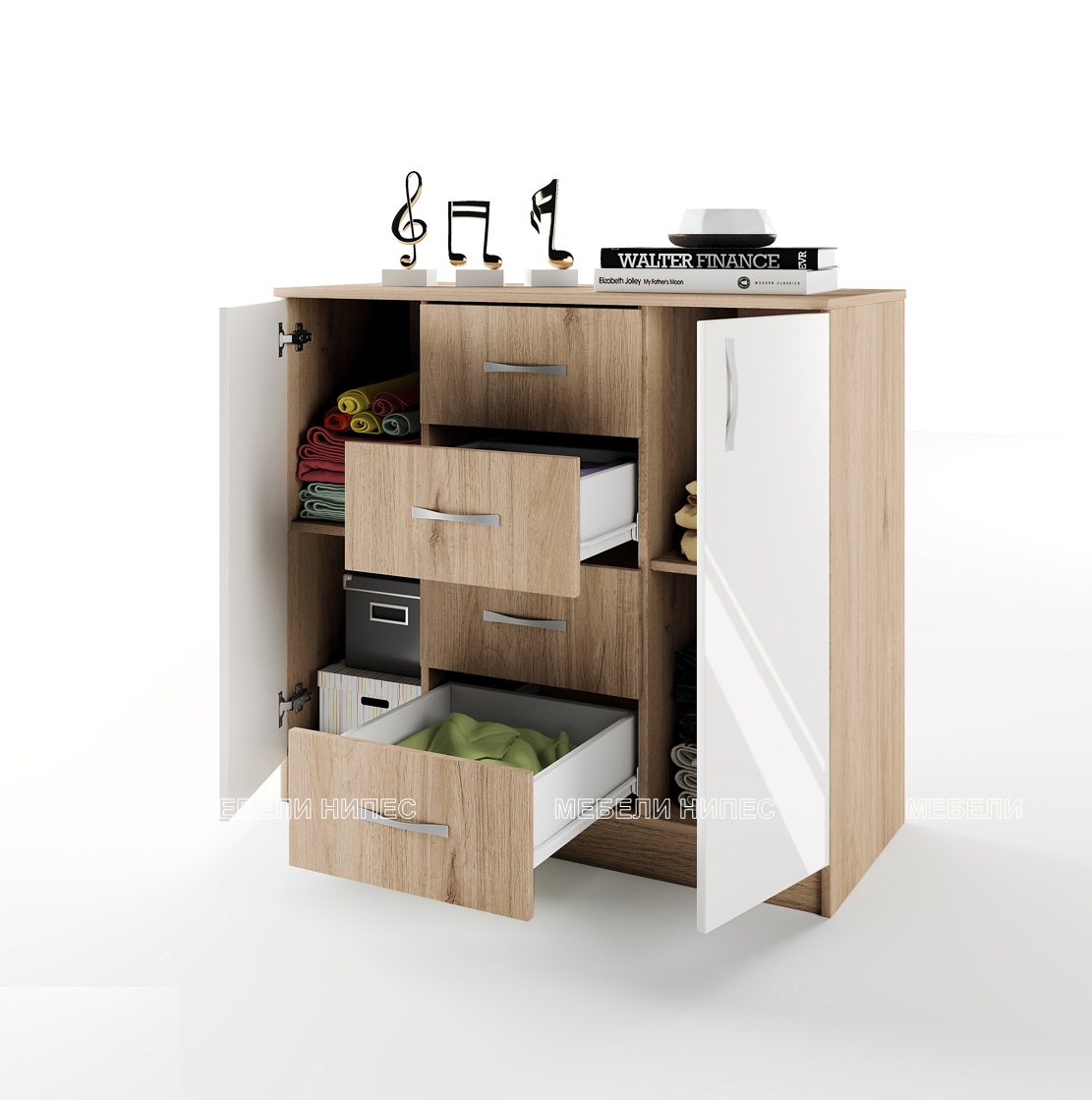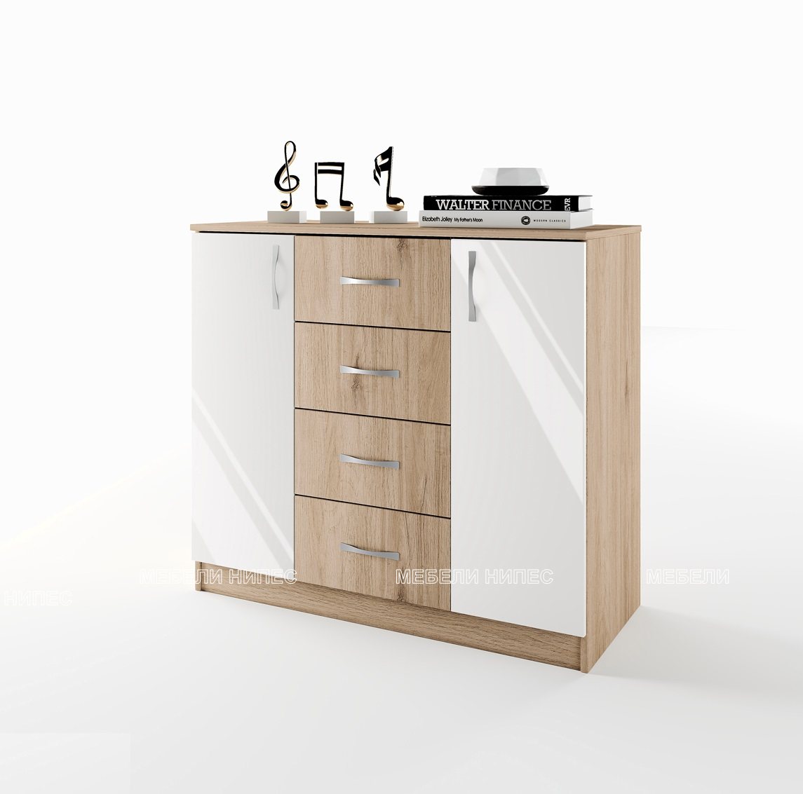 Скрин Сити 3004 сонома арвен/бяло гланц с 4 чекмеджета и две врати, с размери: