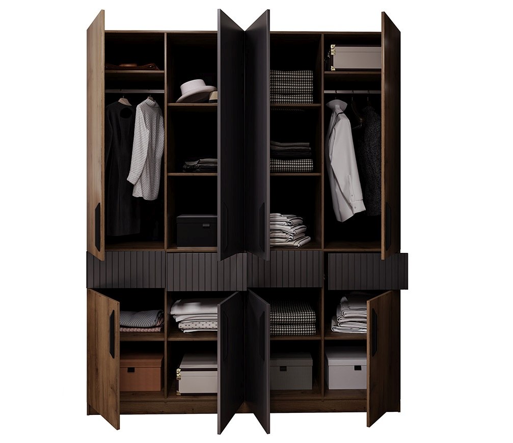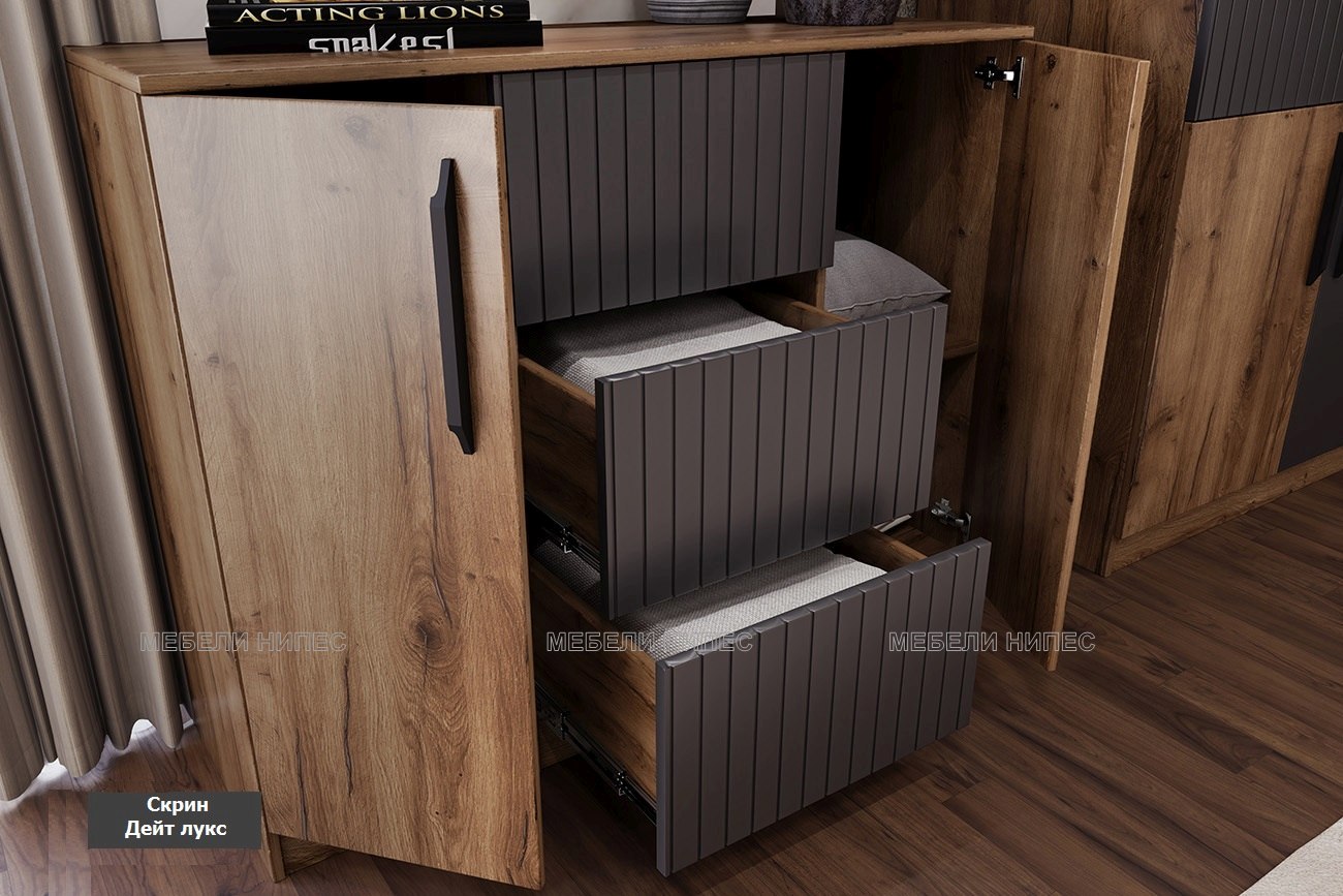 „Дейт лукс“ е съвременен спален комплект, който впечатлява с уникалната си комбинация от модерен дизайн, висококачествени материали и практичност във всеки елемент. Визуалният фокус пада върху стилно оформената табла на леглото, която стиго до земята с вградено LED осветление и декоративни вертикални линии, изработени от фолиран MDF в изискан карбон мат. Всяко чекмедже в комплекта е с чело от MDF и се отваря с удобен push механизъм. Гардеробът е с впечатляваща височина от 230 см, което го прави не само стилен, но и изключително функционален – идеален за пълноценно използване на вертикалното пространство. Скринът „Дейт лукс“, който можете допълнително да добавите е проектиран да внесе повече стил, подреденост и практичност във всяка спалня.