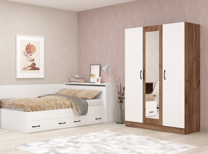 • Пълен комплект с трикрилен гардероб, легло с ракла и чекмеджета и бюро Студио 230 - Мебели Нипес
