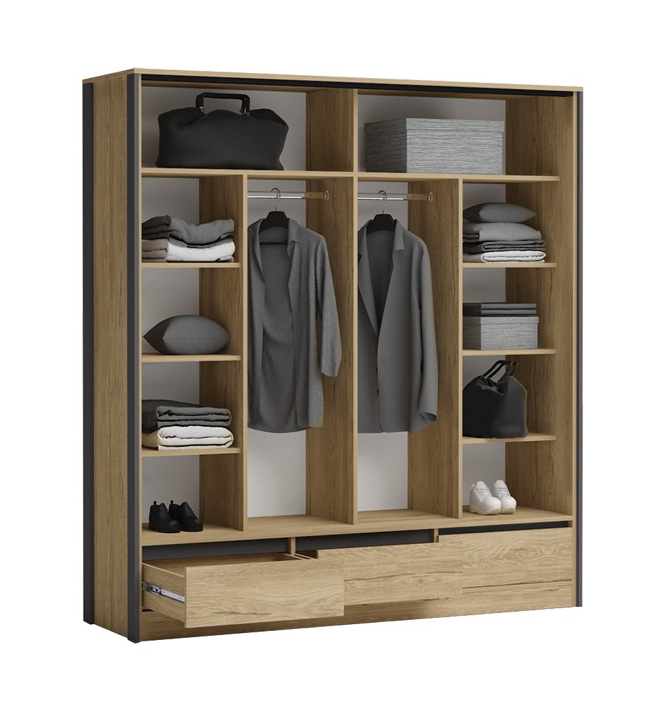 Добавете луксозен завършек към вашия дом със спален комплект „Соренто голд“. Изисканата текстура на висококачествения МДФ 18 мм не само придава издръжливост, но и добавя изключителна естетика, висок клас и финес към всеки елемент от комплекта. Гардеробът с плъзгащи врати е невероятно удобен и съчетава стил с функционалност. Трите чекмеджета, рафтове и лостове гарантират, че вашият гардероб ще бъде перфектно организиран. Спалнята към комплекта е замислена за удобство и лесен достъп до личните ви вещи посредством 4те чекмеджета. Нощните шкафчета предоставят допълнитело място за съхранение на книги, осветление или любими предмети. Всички чекмеджета са с телескопични водачи, за пълно изтегляне и плавно прибиране.
