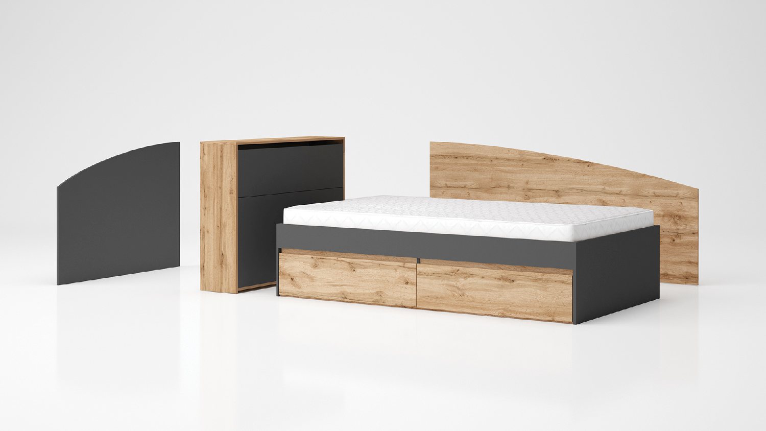 Високо модулна приста Лео 120 ви предлага избор от различни варианти за конфигуриране. Всеки един детайл се предлага самостоятелно, като по този начин сами избирате какво да включва вашето легло – ☑️ легло-база с 2 чекмеджета за матрак 120/200 см, ☑️ странична (дълга) табла, ☑️ къса табла и ☑️ ракла с предно отваряне.